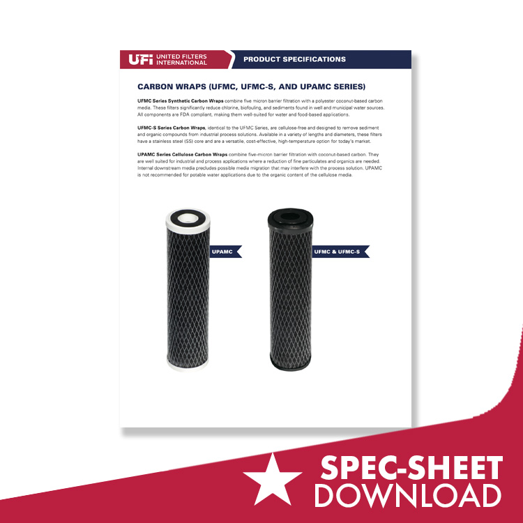 UFMC Series Synthetic Carbon Wraps combine five micron barrier filtration with a polyester coconut-based carbon media. These filters significantly reduce chlorine, biofouling, and sediments found in well and municipal water sources. All components are FDA compliant, making them well-suited for water and food-based applications.