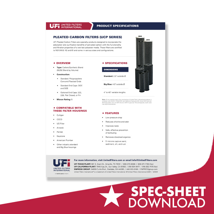 Certified to NSF/ANSI 42 and 61 standards. These pleated cartridges offer five-micron filtration with 50% PAC carbon content by weight and volume. These filters are ideally suited for single filter applications where space precludes multi-staged filtration applications. The UCP series is well-adapted to address silt, color, odor, chlorine, and biofouling common in many potable water sources.