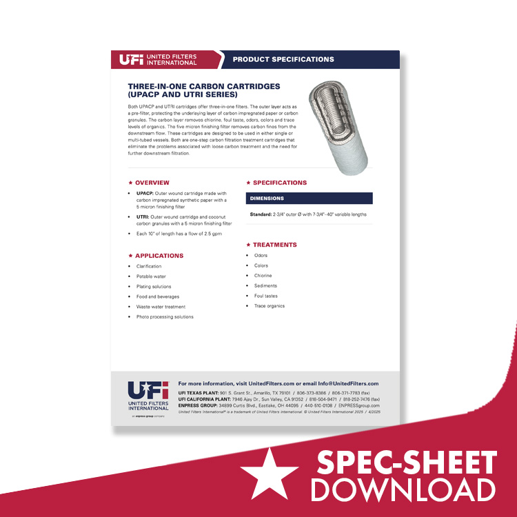 Both UPACP and UTRI cartridges offer three-in-one filters. The outer layer acts as a pre-filter, protecting the underlaying layer of carbon impregnated paper or carbon granules. The carbon layer removes chlorine, foul taste, odors, colors and trace levels of organics. The five micron finishing filter removes carbon fines from the downstream flow. These cartridges are designed to be used in either single or multi-tubed vessels. Both are one-step carbon filtration treatment cartridges that eliminate the problems associated with loose carbon treatment and the need for further downstream filtration.