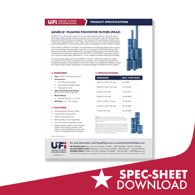 For drinking water applications, utilize AZURE-D™ filtration media where submicron ratings are required for the removal of cryptosporidium and giardia cysts. Available in any pleated filter configuration available, UFI can design for any filtration needs, from standard filter designs to special and unique company-specific configurations. Durable filter designs maximize dirt holding capacity.
