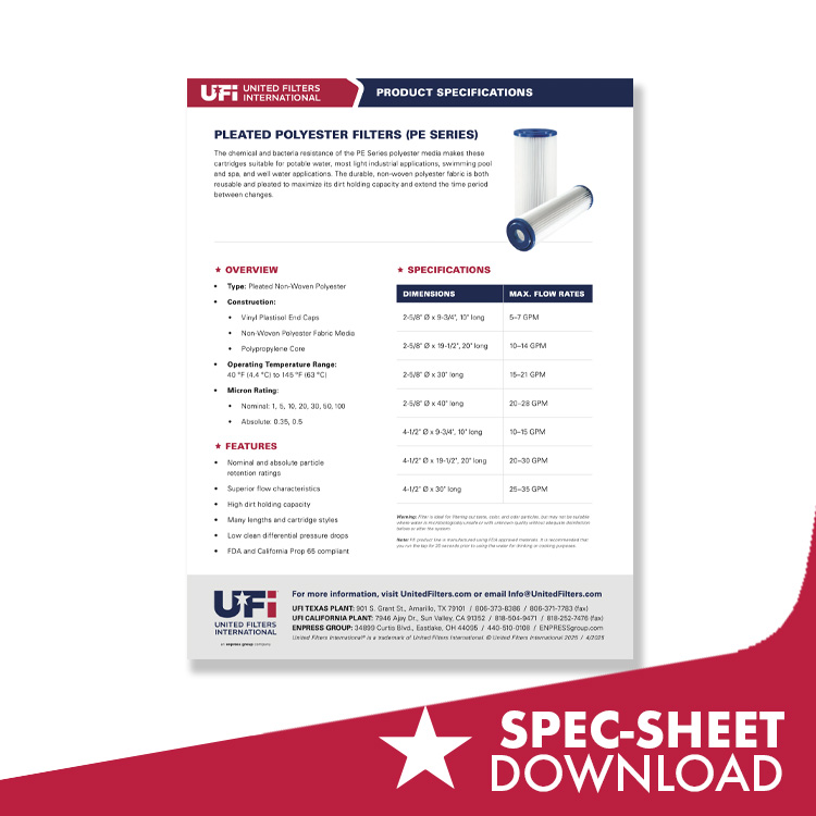 The chemical and bacteria resistance of the PE Series polyester media makes these cartridges suitable for potable water, most light industrial applications, swimming pool and spa, and well water applications. The durable, non-woven polyester fabric is both reusable and pleated to maximize its dirt holding capacity and extend the time period between changes.