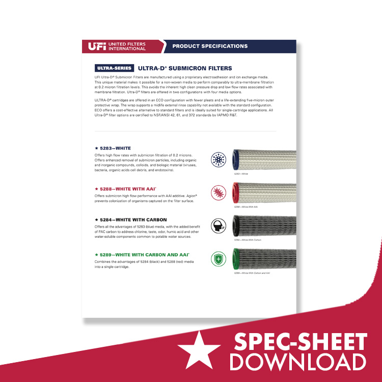 UFI Ultra-D® Submicron Filters are manufactured using a proprietary electroadhesion and ion exchange media. This unique material makes it possible for a non-woven media to perform comparably to ultra-membrane filtration at 0.2 micron filtration levels. This avoids the inherent high clean pressure drop and low flow rates associated with membrane filtration. Ultra-D® filters are offered in two configurations with four media options.